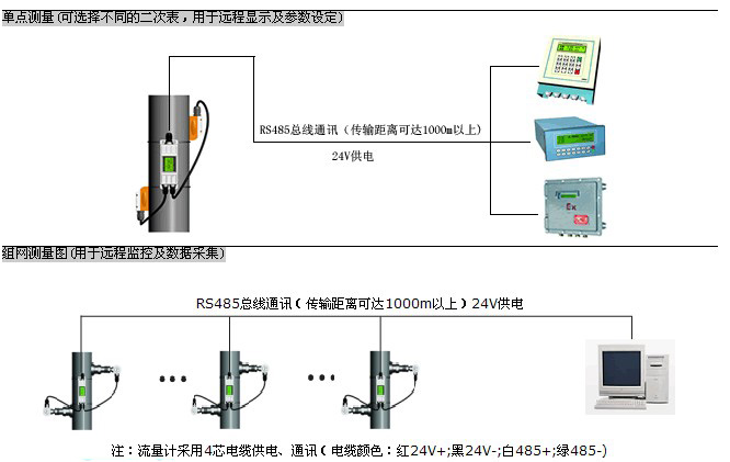 一次表與二次表(或計算機)之間采用RS-485總線通訊,采用普通電纜即可,傳輸距離可達1000米以上,組網(wǎng)十分方便、快捷。這種傳輸方式抗干擾能力強,解決了分體式超聲波流量計專用電纜成本高、抗干擾能力差、傳輸距離短等問題。